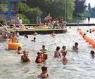 mit einer Rutsche von ca 50 mtr, Länge. Weiterhin handelt es sich hier um einen Abenteuer Spielplatz. Gleich daneben befindet sich ein Bolzplatz in unmittelbarer Nähe des Schwimmbades